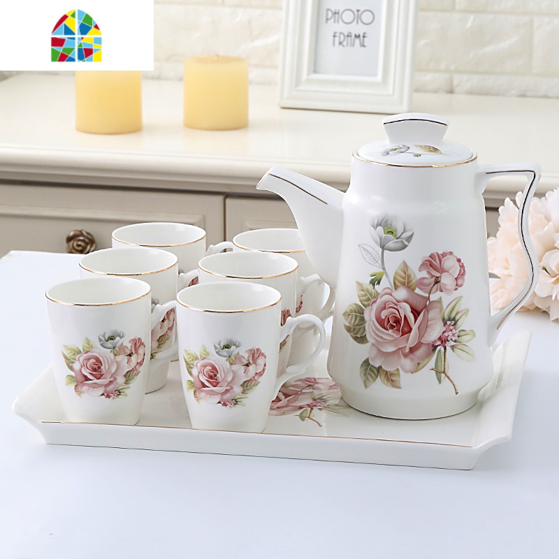 欧式冷水壶陶瓷凉水壶套装家用客厅水杯茶杯凉水杯套装杯具带托盘 FENGHOU 花海一壶六杯(陶瓷盘)¥195.00热销中
