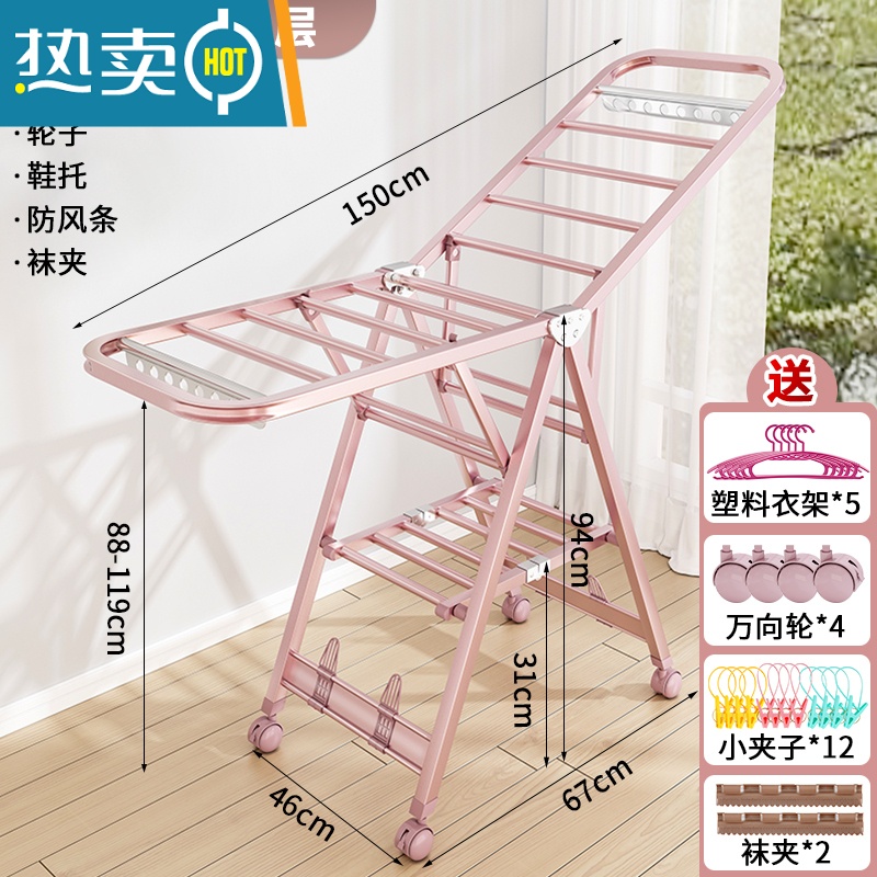 XIANCAI铝合金晾衣架落地折叠卧室内家用晒衣杆凉阳台简易婴儿挂衣服架子 玫瑰金1.5米双层+鞋托+万向轮+防风条 1¥250.20热销中 -