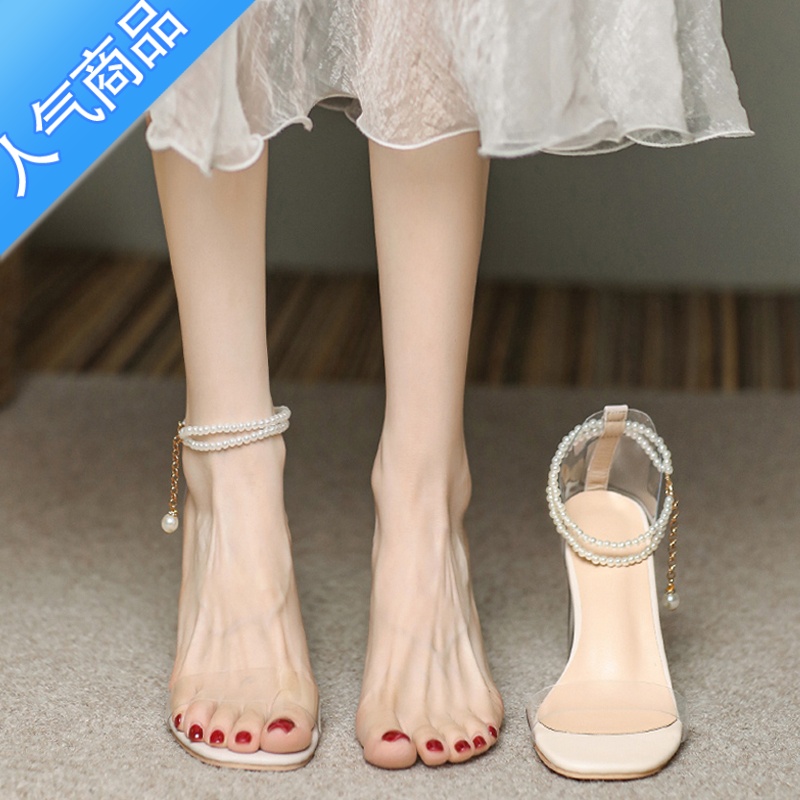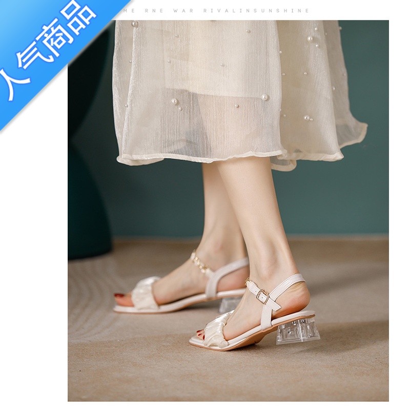 SUNTEK凉鞋女2023年夏季新款气质韩版百搭水晶粗跟一字带仙女风高跟鞋女 米白色 37¥99.00热销中 -