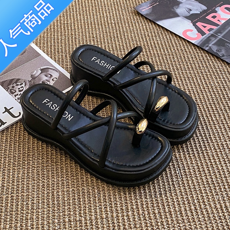 SUNTEK痞老板原创女鞋2023年夏季露趾坡跟高跟鞋一字带凉鞋绝美厚底拖老 黑色 35¥61.02热销中 -