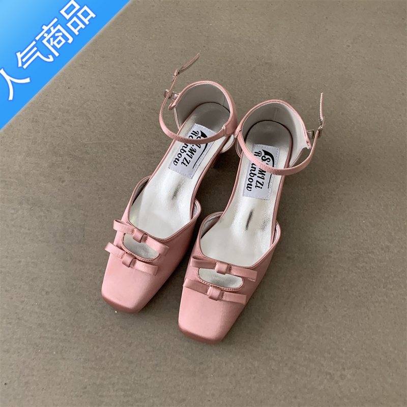 SUNTEK法式精致少女绸面方头奶油色闪闪水钻方扣蝴蝶结粗跟一字扣带凉鞋 769-2粉色 38¥136.80热销中 -