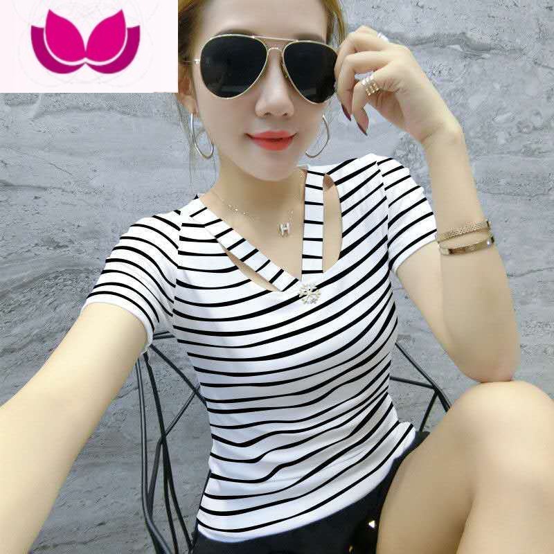 七斓2022夏季新款韩版修身百搭显瘦时尚V领条纹T恤女短袖打底衫上衣 2XL建议125-135斤 小条纹领券满99用2¥23.00热销中 -