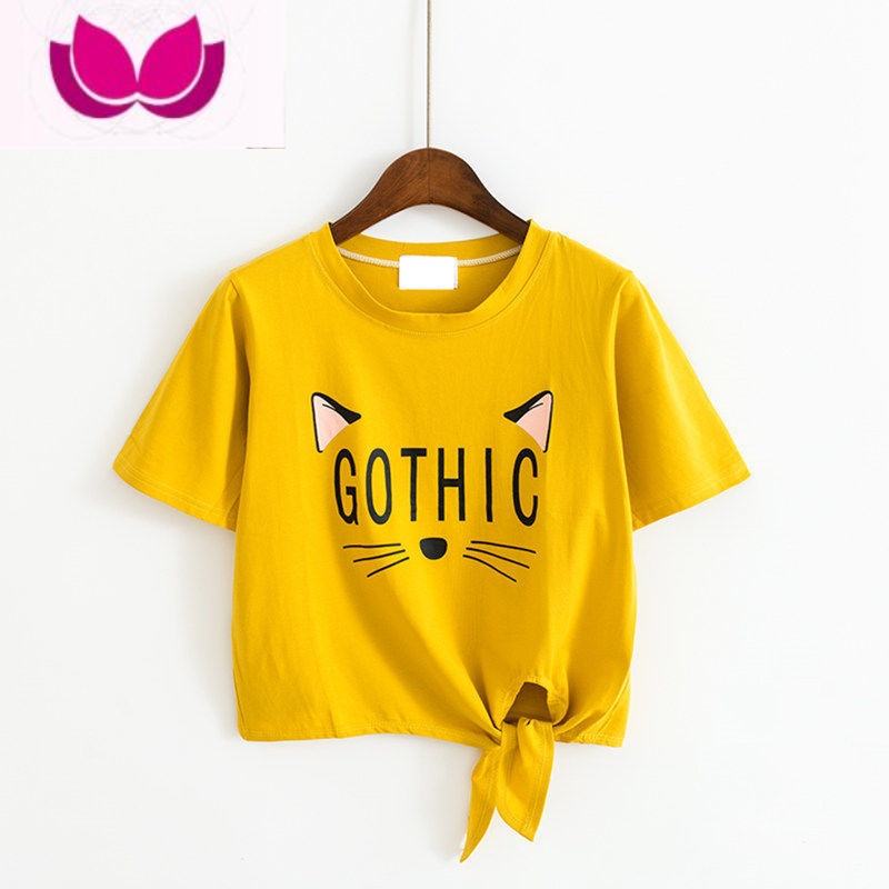 七斓短款T恤女夏装心机小众设计感2023新款韩国学生高腰露脐感高夏感 M 309#黃色绑带猫字母¥16.00热销中 -