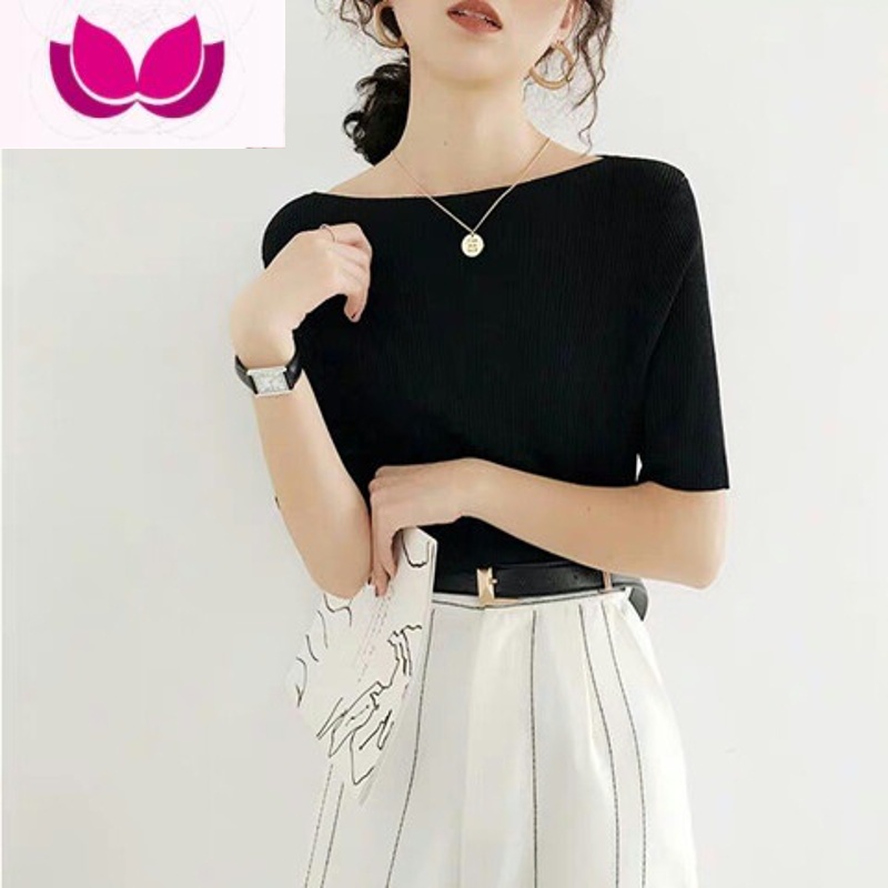 七斓一字领薄款冰丝短袖t恤女夏季装新款2021显瘦黑色五分袖百t2新 M100-110斤 一字领黑领券满99用2¥20.00热销中 -
