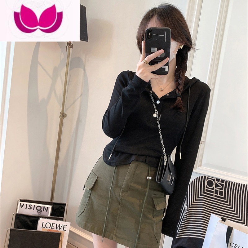 七斓连帽长袖t恤女2023春装新款修身显瘦短款洋气上衣打底衫ins潮卫衣 M 黑色领券满99用2¥88.00热销中 -