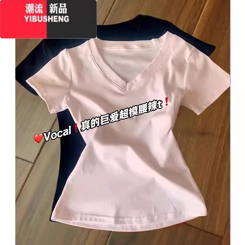 YIBUSHENG天蓝色v领短袖t恤女季正肩掐腰设计感收腰修身显瘦奶黄色上腰 S 粉色V领掐腰款¥54.00热销中 -