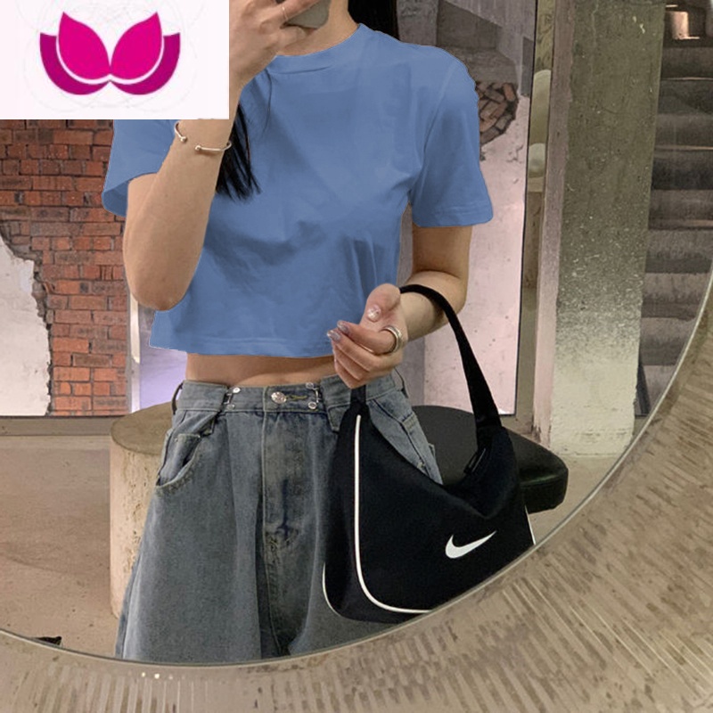 七斓2023夏季新款别致设计感小众短款辣妹上衣正肩短袖t恤女半袖体恤 M 牛仔蓝¥13.00热销中 -