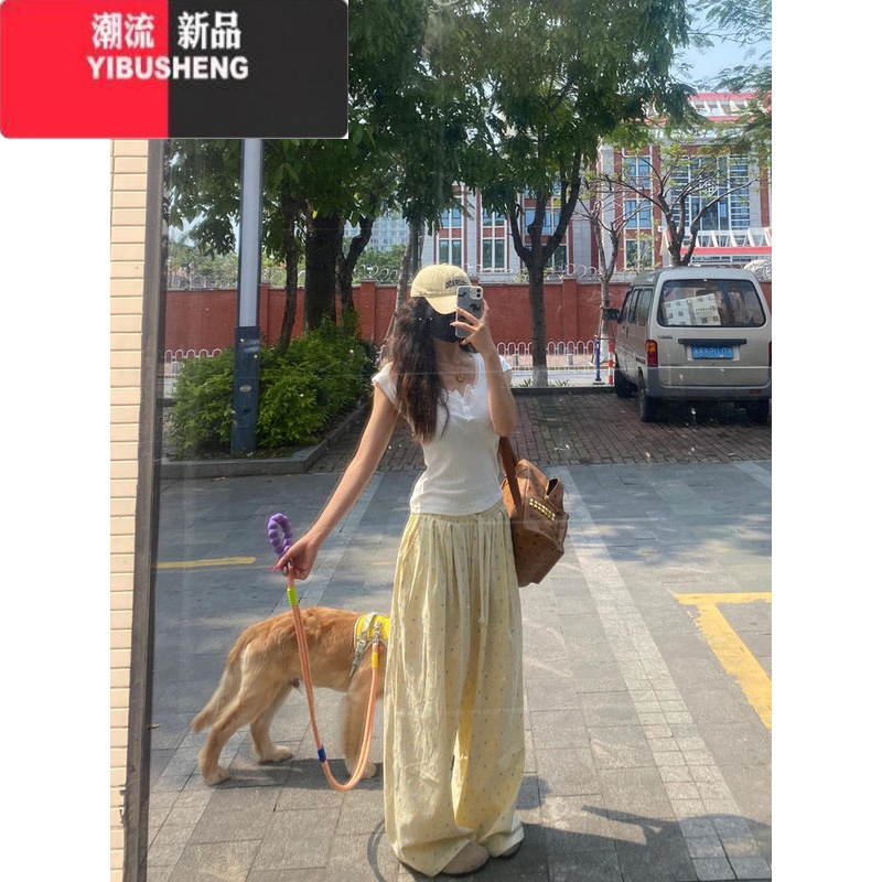 YIBUSHENG纯欲蕾丝花边U领短袖T恤女季2024新款修身显瘦甜辣别致短款上季 M 黄色波点裤子优质版¥108.00热销中 -