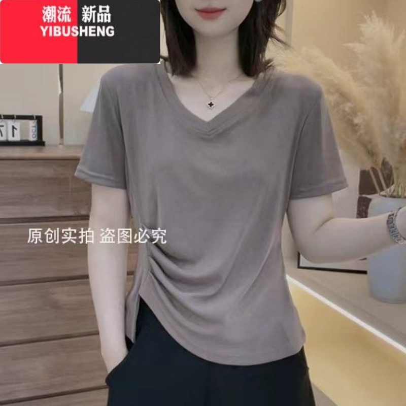 YIBUSHENG新款v领正肩短袖T恤女设计感不规则修身褶皱遮肚显瘦百搭上衣I L90-110斤 奶咖色¥29.00热销中 -