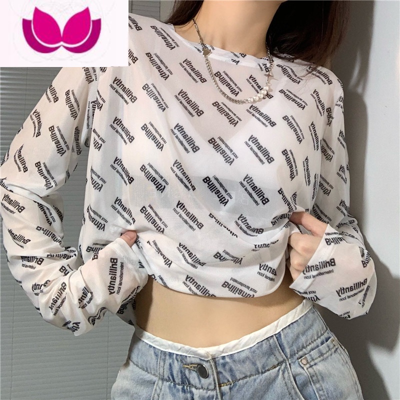 七斓印花网纱打底衫女2021夏季新款冰丝薄款宽松长袖内搭上衣T新 M95-105斤 白色领券满99用2¥27.00热销中 -
