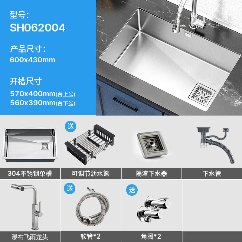 自营 SEREN HOME 赛恩水槽洗菜盆单槽拉丝304不锈钢容量槽盆台上台下厨房洗碗池 60*40水槽+雨幕抽拉头龙¥709.00热销中 -