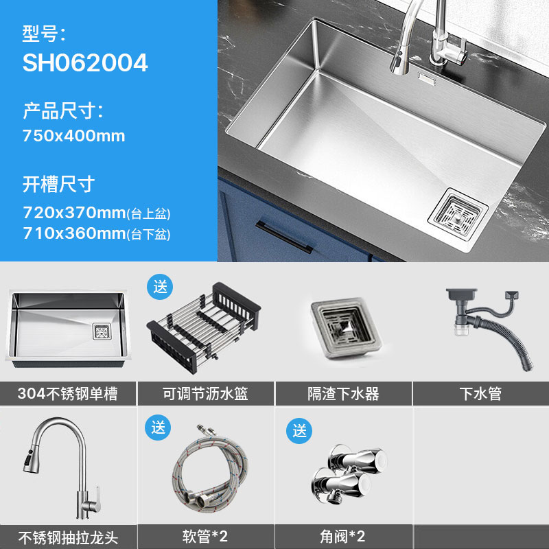 自营 SEREN HOME 赛恩水槽洗菜盆单槽拉丝304不锈钢容量槽盆台上台下厨房洗碗池 75*40水槽+拉丝抽拉龙头¥706.30热销中 -
