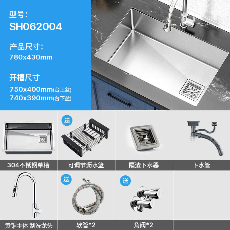 自营 SEREN HOME 赛恩水槽洗菜盆单槽拉丝304不锈钢容量槽盆台上台下厨房洗碗池 78*43水槽+拉丝抽拉龙头¥729.00热销中 -