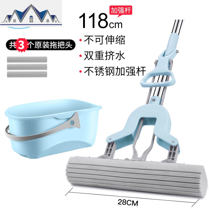 吸水拖把对折式挤水海绵拖布一拖家用胶棉头干湿两用地拖净免手洗_352 28cm共3个头+桶/不锈钢加强杆¥81.00热销中 -