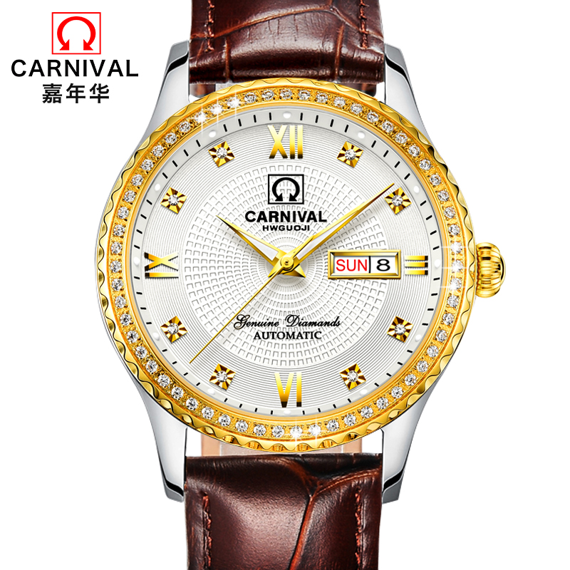 嘉年华CARNIVAL手表新款男士全自动机械表 男表时尚满天星镶水钻防水夜光精钢带腕表双日历星期显示休闲商务复古8629 间金白面皮带赠品¥429.00热销中 -