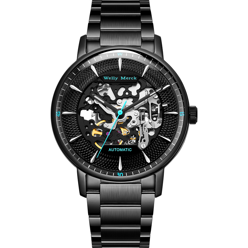 welly merck威利默克手表男新款自动机械表品牌正品防水时尚男表钢带镂空腕表WM017M 全黑钢带¥2150.00热销中 -