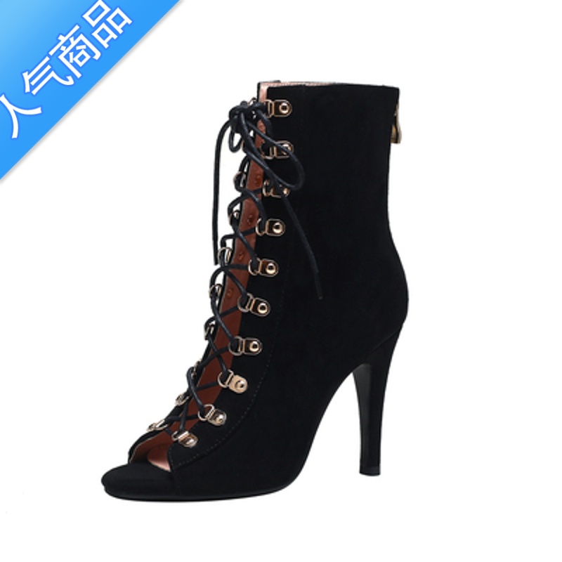 SUNTEK系带短靴子夏季镂空鱼嘴凉靴女细跟凉鞋JAZZ爵士舞高跟跳舞鞋大码 黑色9cm 39¥225.00热销中 -
