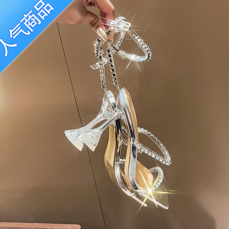 SUNTEK罗马粗跟凉鞋女夏季2023新款气质名媛方头酒杯跟水钻透明高跟鞋女 银色9厘米 38¥276.00热销中 -