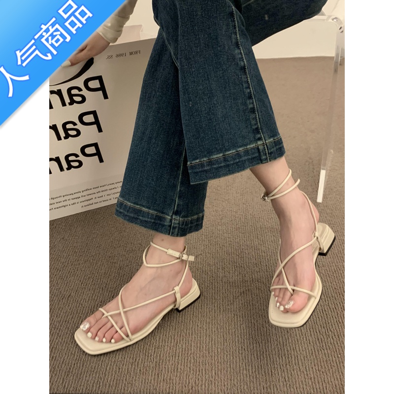 SUNTEK复古露趾方头平底百搭凉鞋2023年夏新款交叉带系带仙女沙滩罗马鞋 杏色 36¥149.04热销中 -