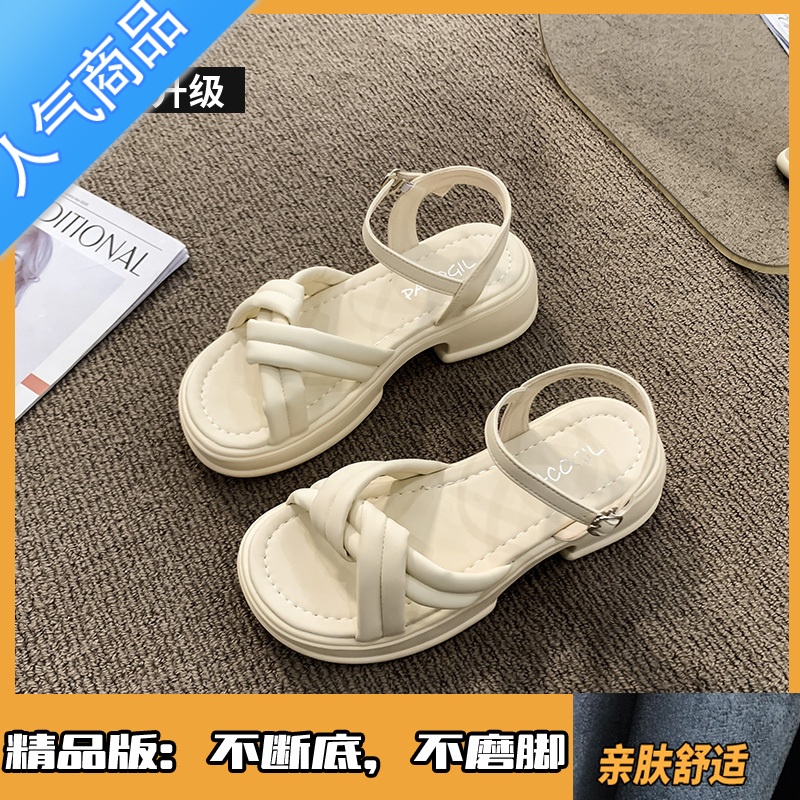 SUNTEK一字带罗马凉鞋女2023年新款夏季仙女风配裙子中跟粗跟高跟鞋 米白色 39¥160.20热销中 -