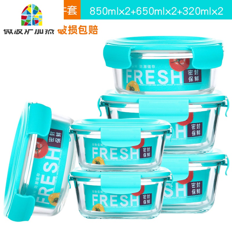 保鲜盒6件套耐热硼硅玻璃保鲜碗带盖密封便当盒玻璃碗FENGHOU 蓝色正方款(850x2+320x2)+圆款650x2¥72.00热销中 -