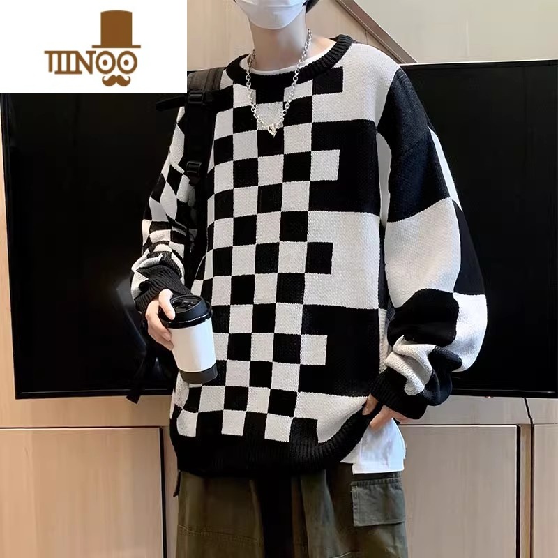 YANXU潮牌格子毛衣男圆领款宽松休闲针织衫男冬季帅气青少年毛线衣 2XL 黑色满69元减1元¥72.00热销中