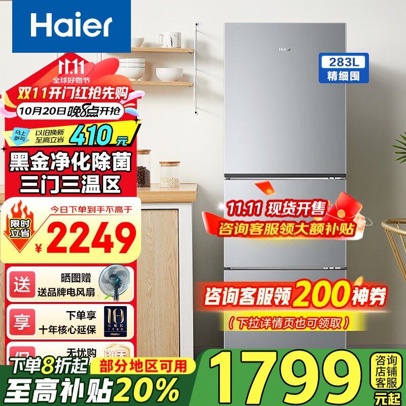 海尔(Haier)冰箱283升风冷无霜一级变频节能 三门三温区BCD-283WLHC357XM惠 满3000元减100元¥2199.00月销量2241评价 98.0%好评 -