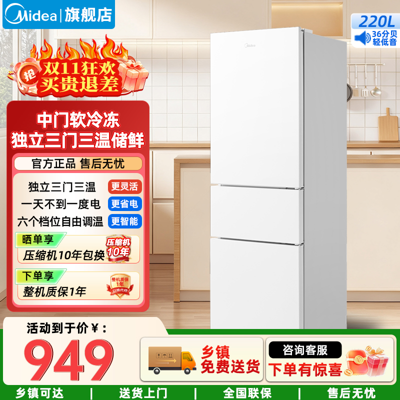 美的(Midea)220升三门三温租房家用客厅宿舍小型冰箱三开门节能省电低音运行以旧换新BCD-220TM【国家补贴】¥1599.00月销量50 -