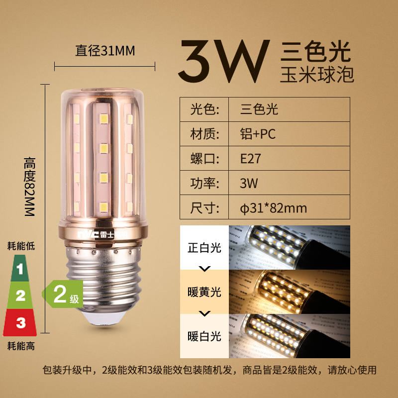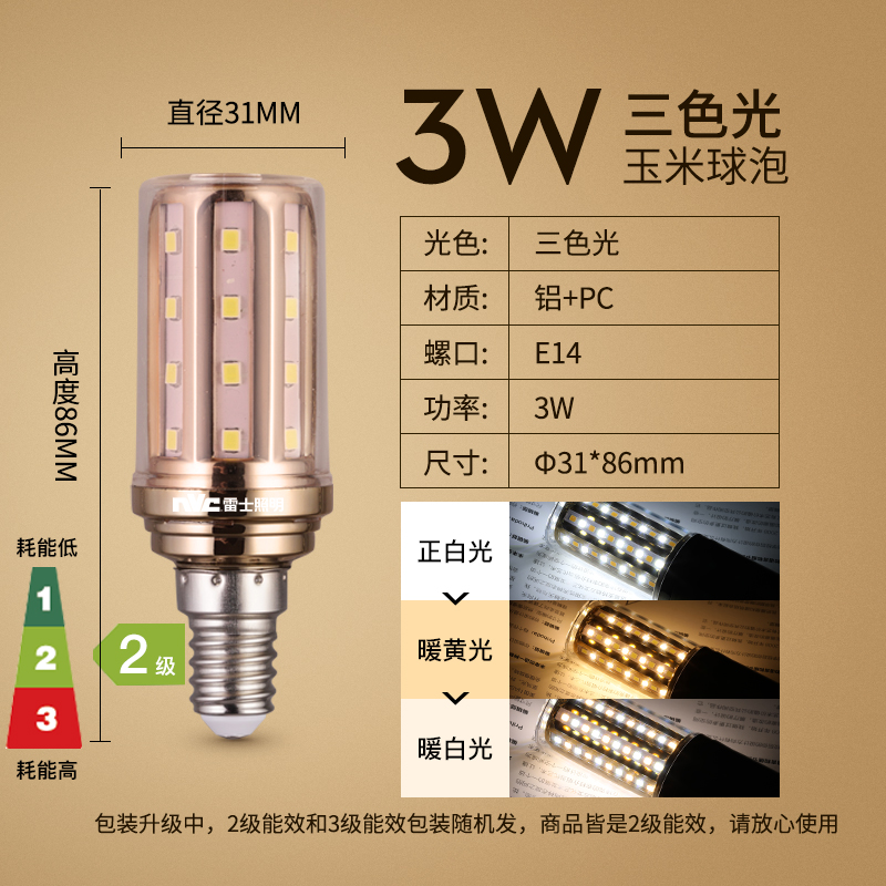 雷士照明(NVC)led灯泡e27e14螺口灯泡家用超亮节能三色变光蜡烛灯泡 光源 3瓦玉米泡丨三色【E27大螺口】¥18.90热销中16评价 100.0%好评