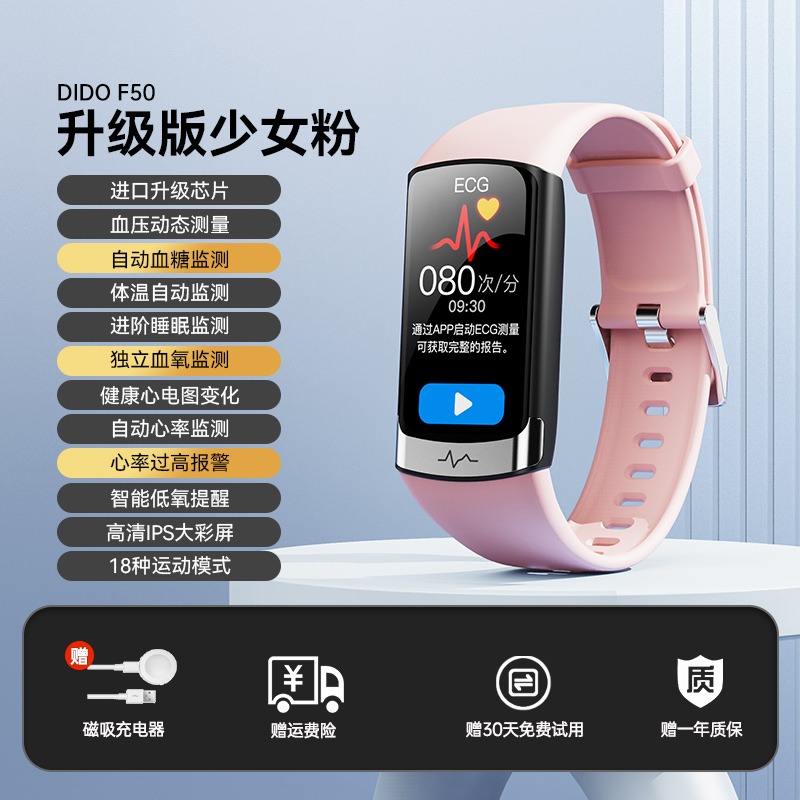 自营 dido F50 高精度血糖无创血压血氧手环智能免扎针24小时动态心率高清健康体温手表运动睡眠跑步测量仪心电老人男女 顶配粉色节日装【打鼾呼吸监测+精准自动监测血糖血压+高性能芯¥1299.00热销中2评价 100.0%好评 -