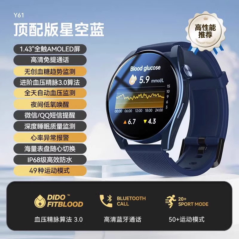 自营 【高清大屏通话】dido Y61 智能通话手表接打电话成人蓝牙男款无创血糖血压测量监控心率血氧圆盘女款运动防水手环 顶配版星空蓝【升级芯片+双向免提通话+自动测量血压血糖血氧+¥789.00热销中 -