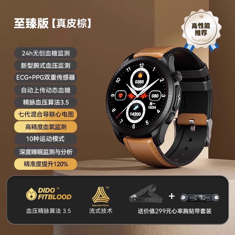 自营 【实时血糖心电】didoE56S无创24小时动态测血糖血压智能手表高精准血氧心率心电运动健康手环老人多功能睡眠 E56S至臻版真皮棕【赠心率胸贴带套装+24h高精准无创血糖¥879.00热销中1评价 100.0%好评 -