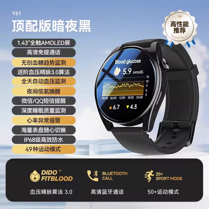 自营 【高清大屏通话】dido Y61 智能通话手表接打电话成人蓝牙男款无创血糖血压测量监控心率血氧圆盘女款运动防水手环 顶配版暗夜黑【升级芯片+双向免提通话+自动测量血压血糖血氧+¥789.00热销中1评价 100.0%好评 -