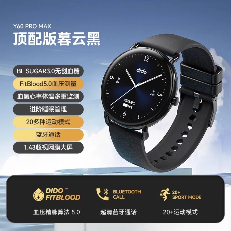 自营 【测血糖智能通话】dido Y20 无创血糖手表智能监测血压心率血氧接打电话运动健康手环男款女士老人测糖仪多功能 升级黑【新型血压自动全天测量】【蓝牙双向通话高清不间断★血糖¥439.00热销中2评价 100.0%好评 -