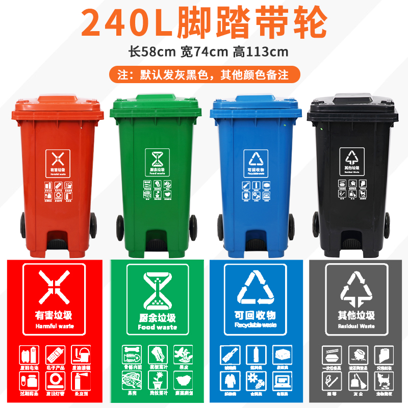 自营 DXBG四色分类垃圾桶大号环保户外可回收带盖厨余商用餐厨公共场合 240L分类脚踏带轮¥1196.00热销中