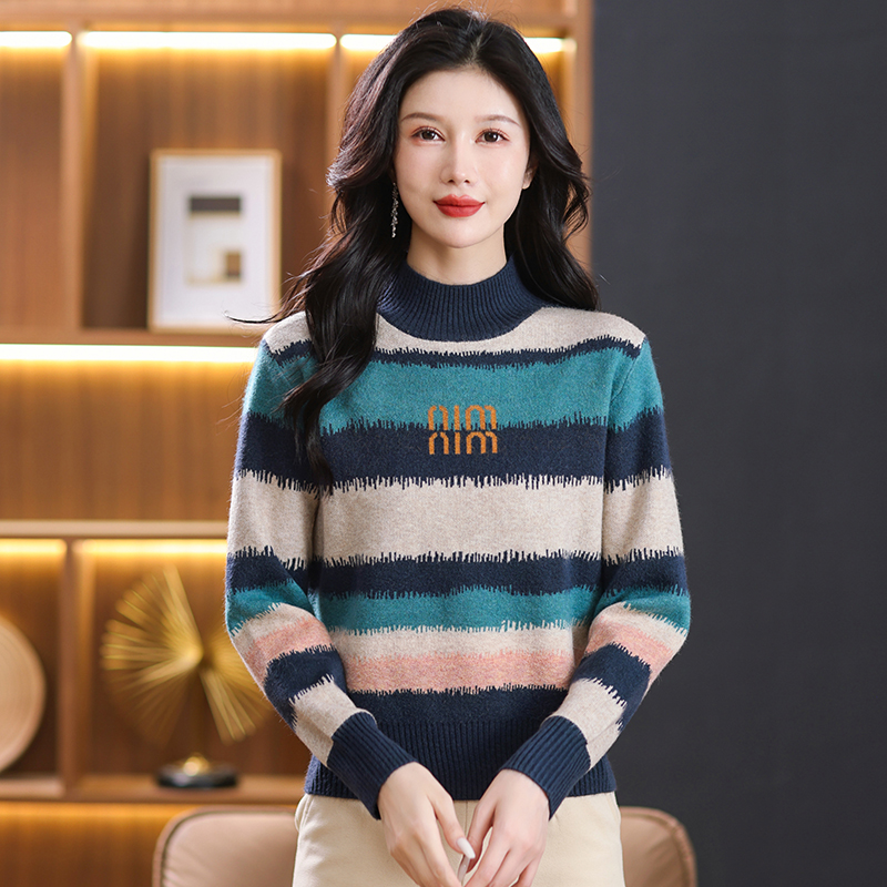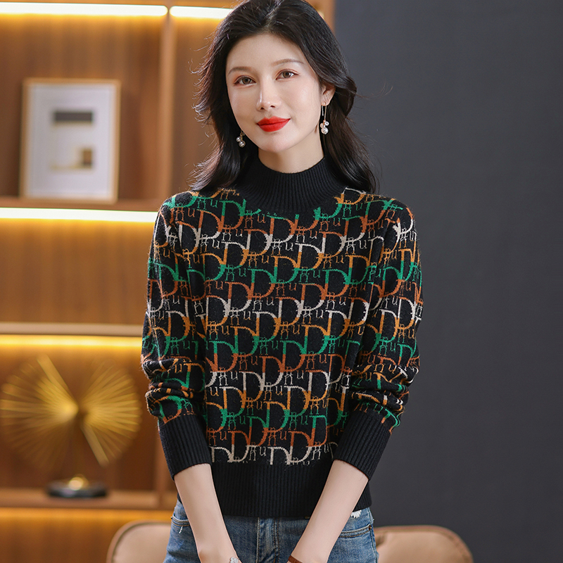 2024春秋新款半高领双股羊绒衫女半高领100%纯山羊绒毛衣印花针织衫宽松慵懒毛衣套头女装上衣针织打底衫加厚外搭毛衣女 6808藏蓝 L¥298.00热销中 -