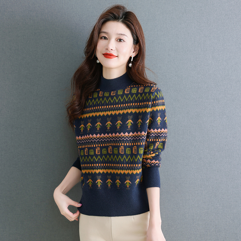 2024春秋新款半高领双股羊绒衫女半高领100%纯山羊绒毛衣印花针织衫宽松慵懒毛衣套头女装上衣针织打底衫加厚外搭毛衣女 01藏青 L¥298.00热销中 -