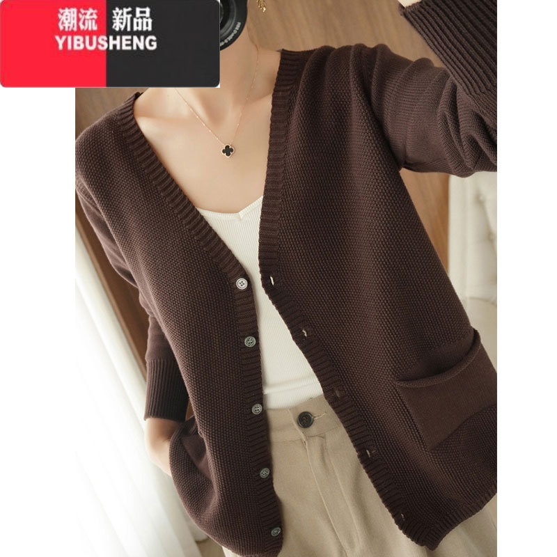YIBUSHENG复古文艺风开衫女V领宽松短款外套针织长袖气质轻熟毛衣 咖啡色 L建议105-120斤