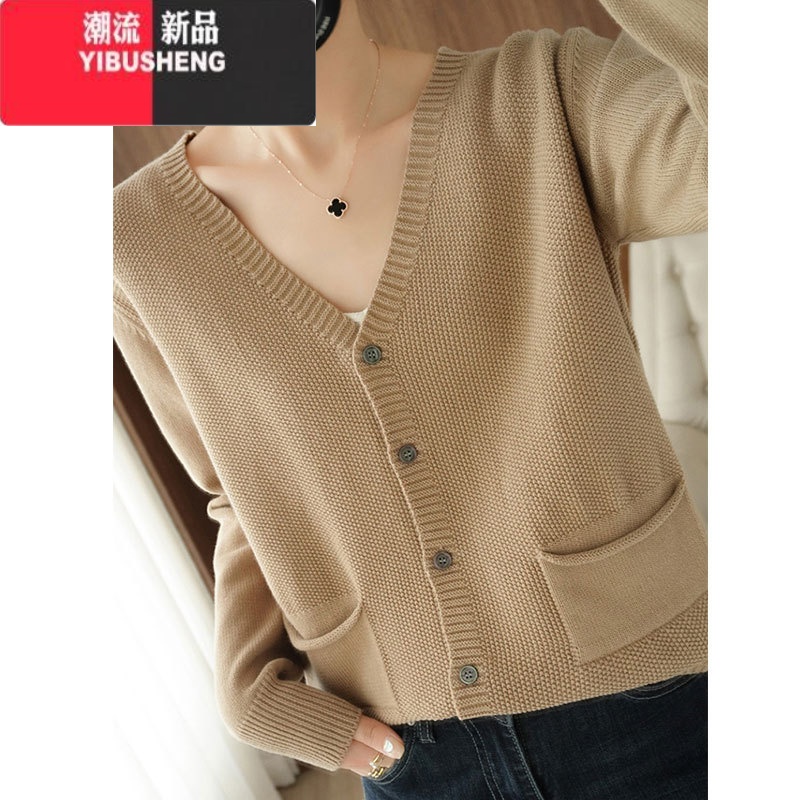 YIBUSHENG复古文艺风开衫女V领宽松短款外套针织长袖气质轻熟毛衣 卡其色 2XL建议130-145斤