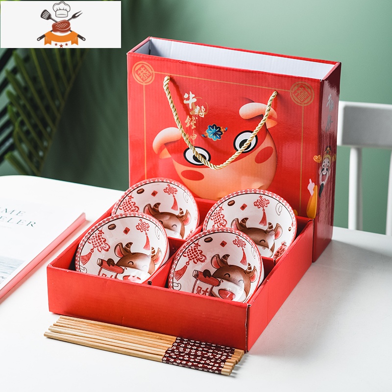 网红日式餐具套装青花瓷碗筷套装定制陶瓷碗碟回礼套碗礼品礼盒装 敬平 大福牛4碗4筷50S4QZ¥24.04热销中
