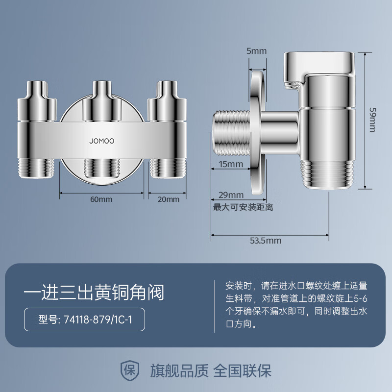 九牧(JOMOO)一进二出角阀铜加厚三通角阀三角阀八字阀冷热水角阀74117/74118 【三控一进三出四通角阀】74118¥109.00热销中 -