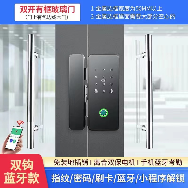 办公室玻璃门指纹锁免开孔密码锁刷卡锁遥控单双门有无框平移门电子智能门锁 免地插双钩蓝牙款 双门有框玻璃门¥568.00热销中 -