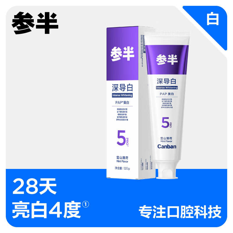 自营 参半深导白Pro5美白牙膏 亮白去黄牙烟渍增白口腔成人清新清洁120g¥39.90热销中