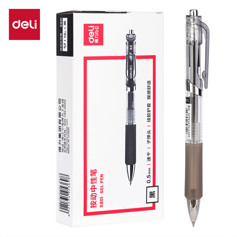 自营 得力(deli)速干中性笔 0.5mm子弹头学生办公签字笔 按动 笔水笔 黑色 12支/盒 SG-S801¥31.01热销中