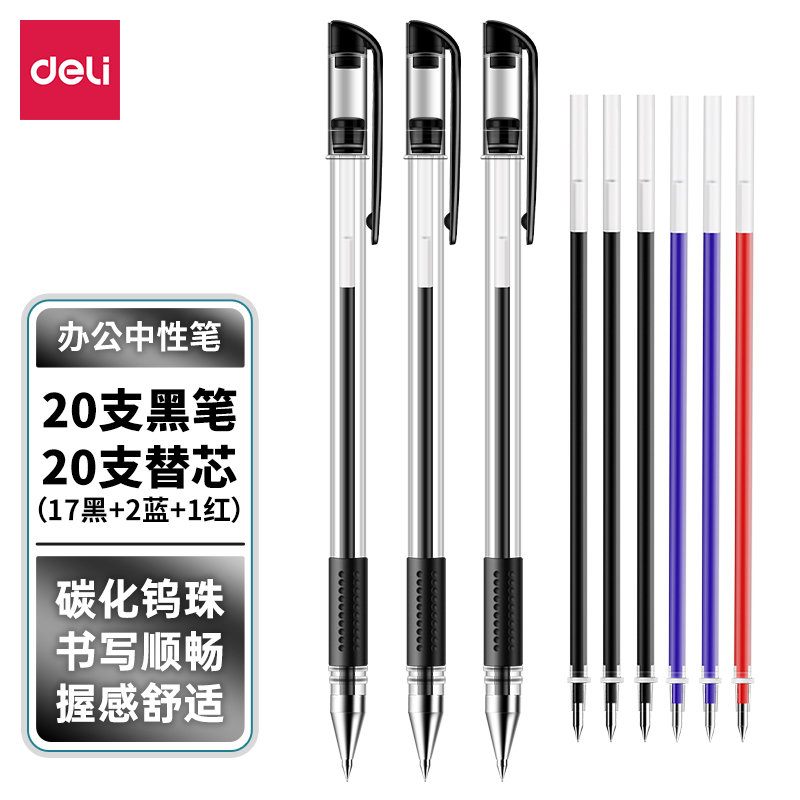 自营 得力(deli)0.5mm中性笔水笔签字笔套装33363(20支笔黑+20支 替芯混)¥32.17热销中
