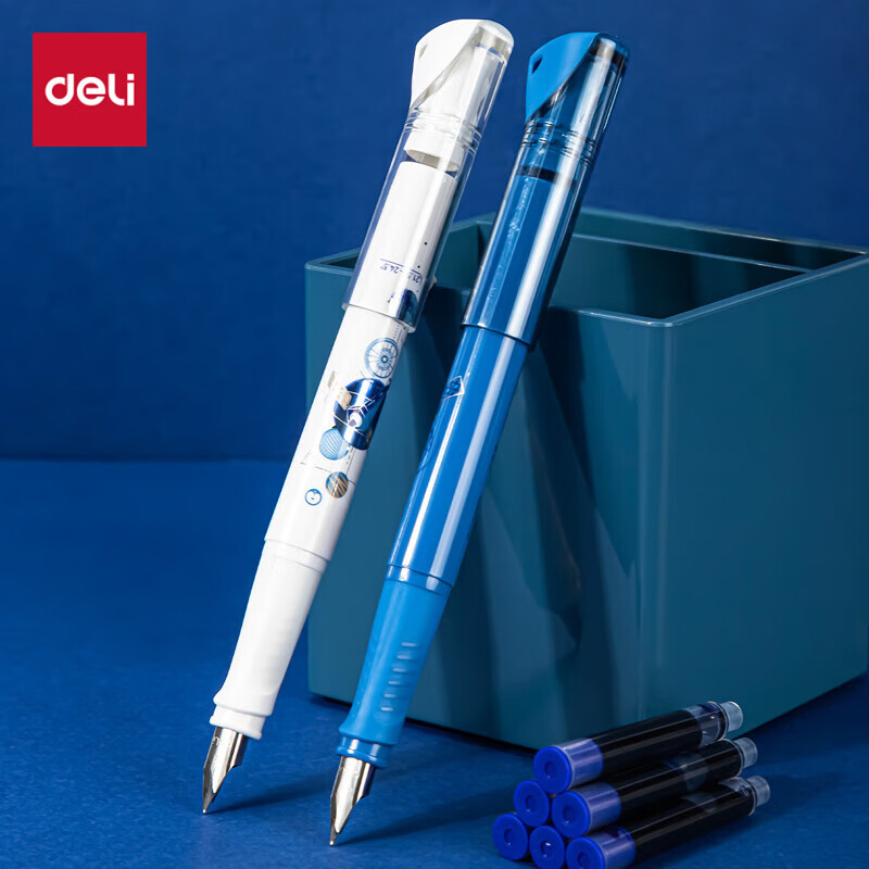 自营 得力(deli)问苍穹学生 钢笔 练字 套装 中小学生墨水笔EF明尖 颜色随机(1笔+4可擦纯蓝墨囊/盒)A957 生日¥17.27热销中