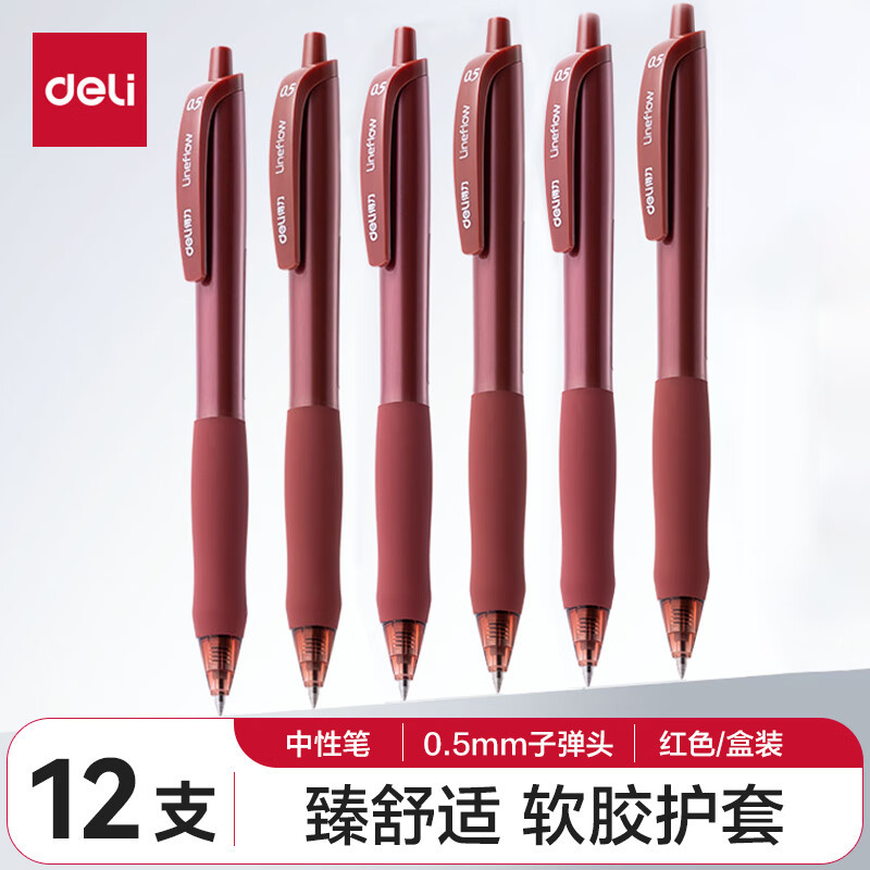 自营 得力(deli)【顺滑之星】臻顺滑中性笔 办公中性笔水笔签字笔0.5mm子弹头12支/盒红色S60¥26.83热销中
