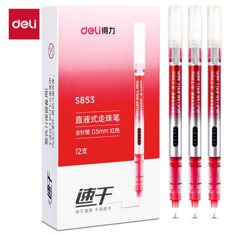 自营 得力(deli) S853 直液笔签字笔 0.5mm全针管 水笔 红色 12支/盒¥18.71热销中