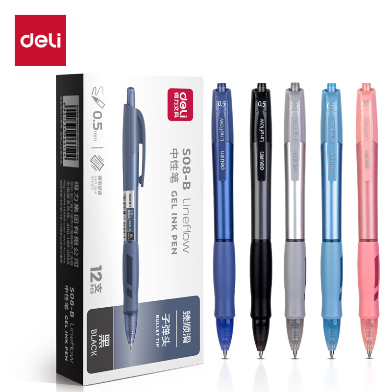 自营 得力(deli)【顺滑之星】臻顺滑纯色风按动 中性笔签字笔 学生办公笔 0.5mm子弹头 12支/盒黑色 S08-B¥22.94热销中