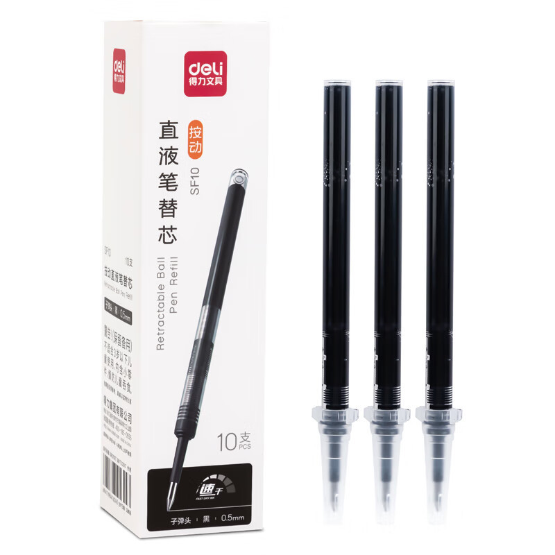 自营 得力(deli)全新按动直液笔替芯0.5mm子弹头 中性笔 出墨流畅书写顺滑 黑色笔芯 10支/盒SF10¥16.15热销中